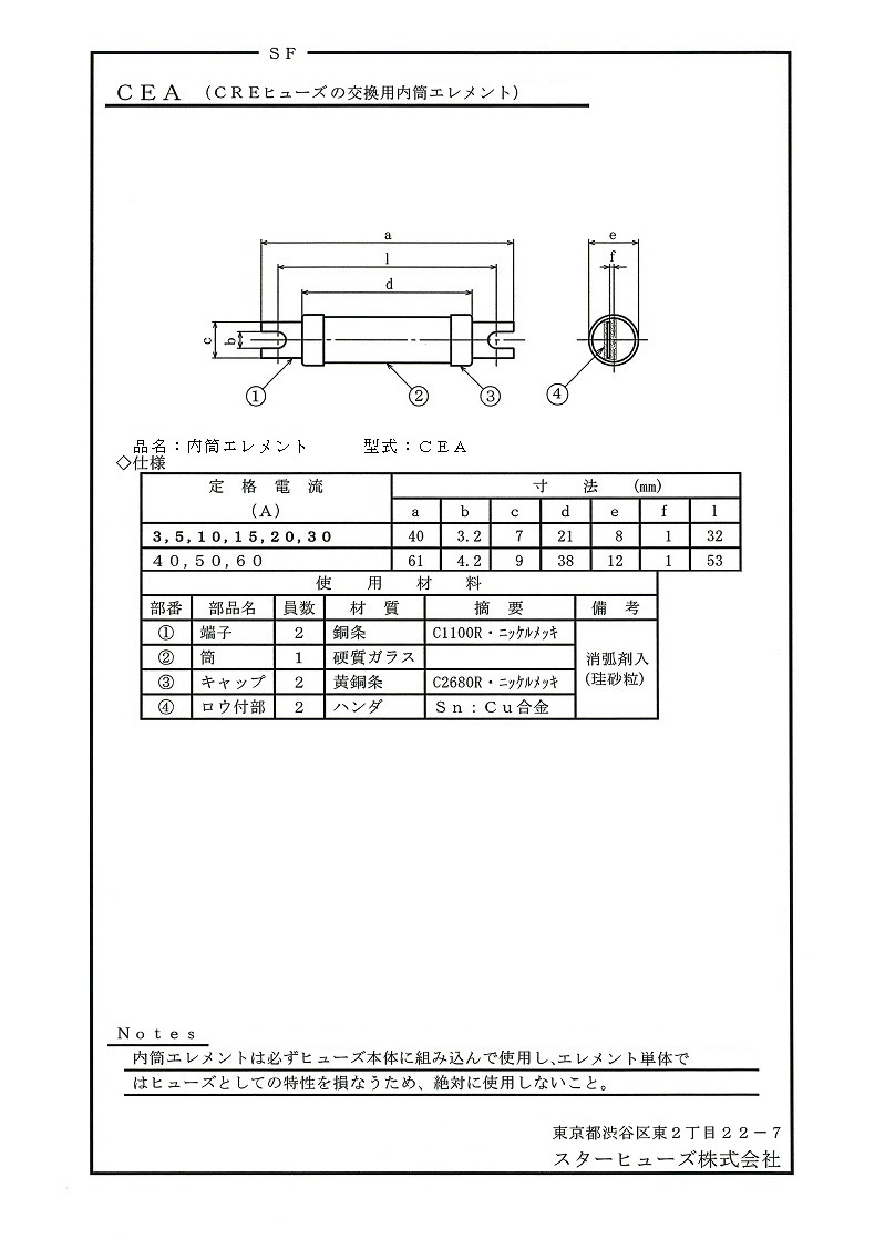 | 性能 | : | 本エレメントは単体ではヒューズとして利用できません。 適合する本体に組込んでご使用下さい。 |