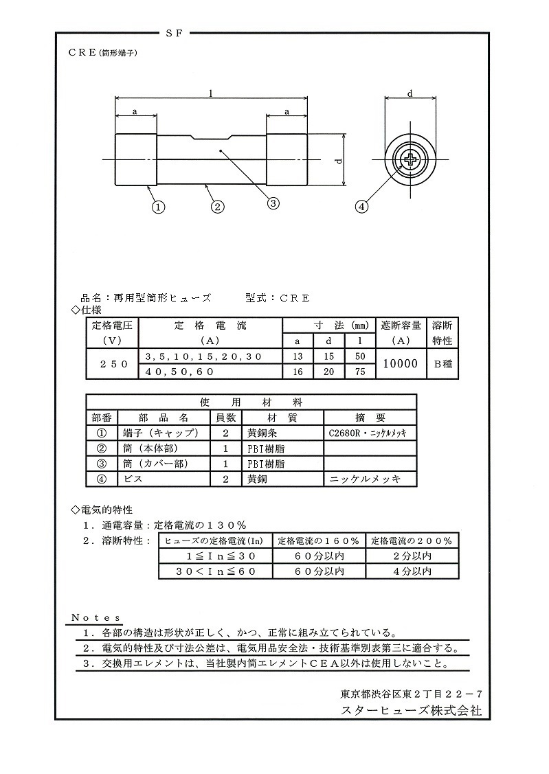 | 性能 | : | 電気用品安全法及び JIS C 8352 (配線用ヒューズ及びホルダー通則)に適合します。 |